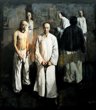 画家执着于这样一个历史主题进行创作,不难感受他对“六君子”的仰慕之情。在作品中,他突破了原先作品的技法和颜色,刻意营造肃穆和纪念碑式的气氛,用整体的形式构架和形式语言,经过不断地锤炼,才使得画面写实却不死板,严肃却又带灵动。仔细观看,画面中还运用了石刻篆书拓片和印鉴及书法条幅等元素,将维新时期发表的那些学报代入作品,而在画面衬托下这些文字又像是六君子在狱中墙上刻下的泣血呐喊,重重地敲打着观者的心门,作为一幅表现历史深刻的作品来说,本画无疑已经达到了自己的目的。