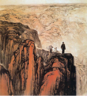 《转战陕北》是一幅以大景山水为主的革命历史画,取材于解放战争时期毛泽东转战陕北的斗争经历。只见画面中的毛泽东背手伫立在巍峨的群山之中,面对壮美的黄土高原仰面眺望、凝神静思。画面中初升的太阳染红了整个群山,象征着共产党人在面对国民党军队的进攻力挽狂澜的英雄气魄和对革命必胜的坚定信念。这幅作品的特别之处在于画家没有用常规的手法去表现领袖人物,而是把伟大领袖毛泽东置于雄浑壮观的高山之巅,而且只是一个很简略的侧影,一反表现领袖形象的固有范式。在整幅画面上,领袖毛泽东仅仅点景而已,但给人的感觉是构图虽小但气势不减,人物虽小但形神兼备。毛泽东背向观众,极目远山的形象,恰到好处地再现出一代伟人傲视苍穹的凛然气概,真实地再现了毛泽东胸中自有雄兵百万,指挥若定的泰然气派和伟人的风采,热情地赞颂了伟大领袖毛泽东为中国革命事业所做出的丰功伟绩。