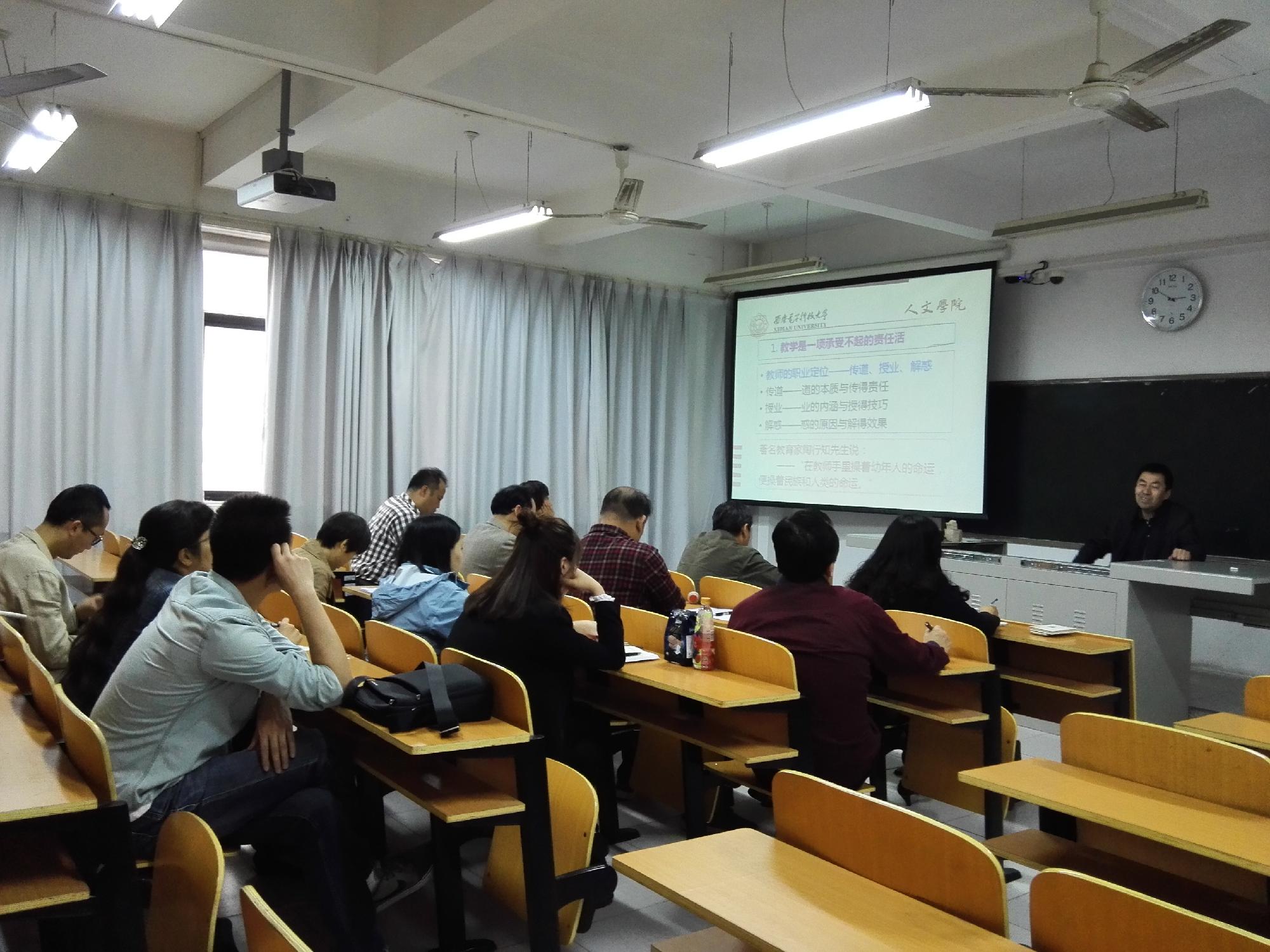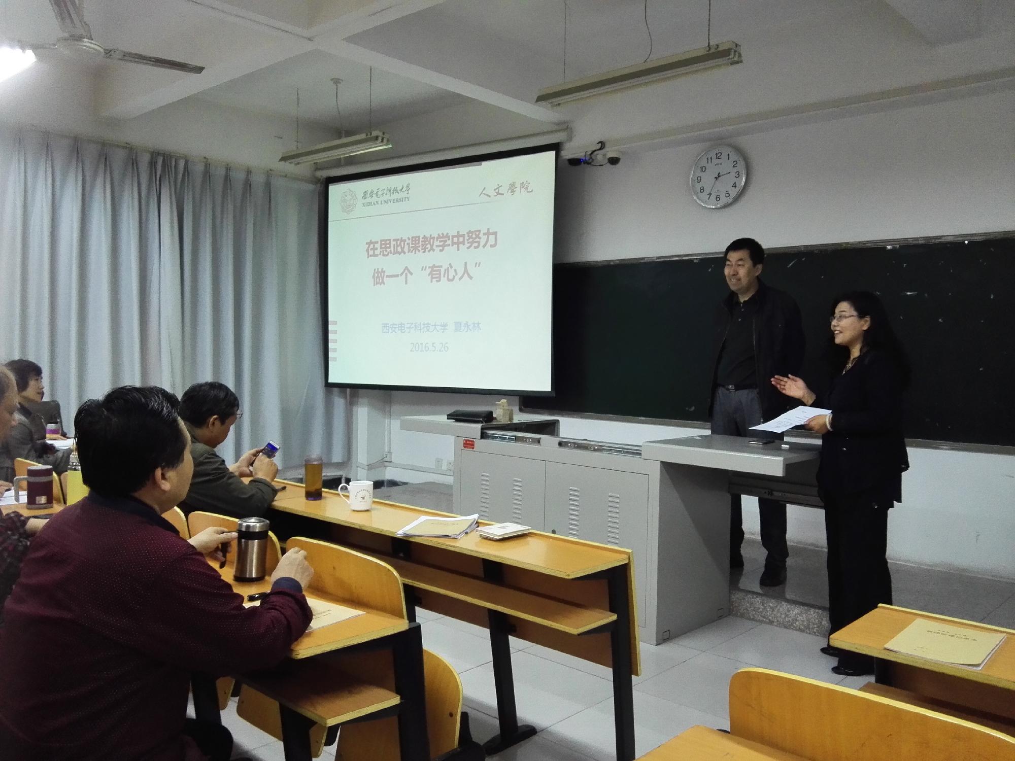 2016年5月26日下午,西安电子科技大学人文学院副院长夏永林教授来我院做《在思政课教学中努力做一个“有心人”》的专题报告。西安美术学院思政部主任沈宝莲主持,思政部教师和形势政策课教师参加。