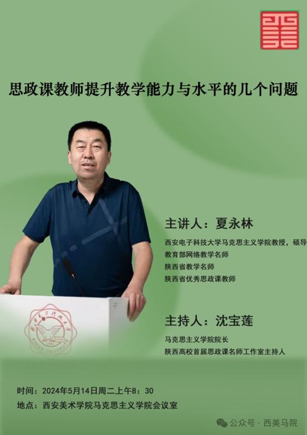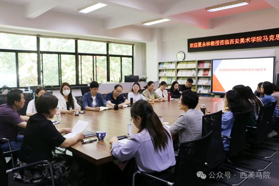 为全面贯彻党的教育方针,落实立德树人根本任务,努力提升思政课教师教育教学能力与水平,进而守正创新推动思政课建设内涵式发展,不断提高思政课的针对性和吸引力,5月14日,教育部网络教学名师、陕西省教学名师、陕西省优秀思政课教师、西安电子科技大学夏永林教授应邀到西安美术学院马克思主义学院作《思政课教师提升教学能力与水平的几个问题》的专题讲座。