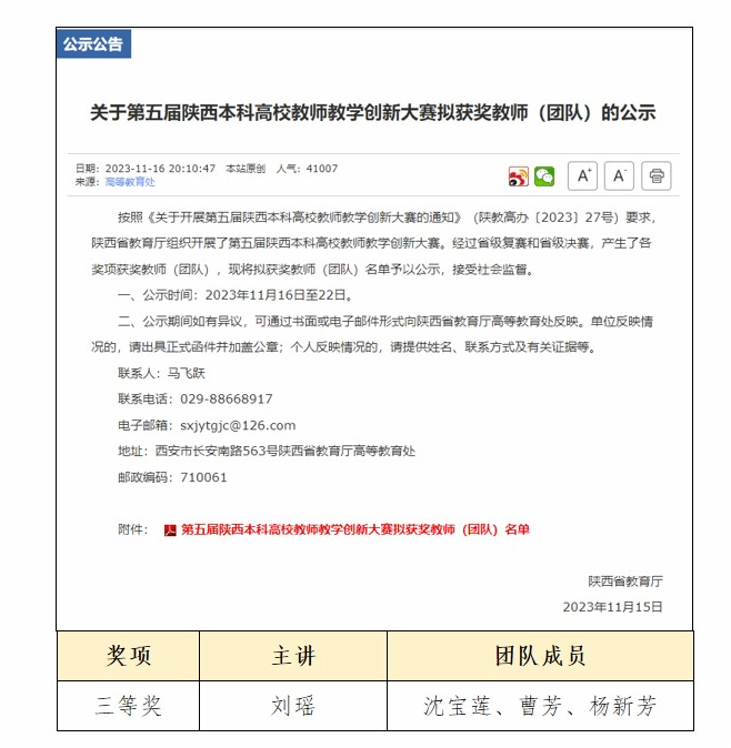 近日,由陕西省教育厅举办的第五届陕西本科高校教师教学创新大赛圆满落幕。本次大赛以“课堂革命,陕西行动”为主题,经校级初赛、省级复赛和省级决赛三个阶段,全省60所高校410名优秀教师进入省级复赛,经专家网络评审,209名参赛教师进入省级决赛。经过层层选拔和激烈比拼,马克思主义学院教师刘瑶(团队成员:沈宝莲、曹芳、杨新芳)凭借独特的创新理念和扎实的教学功底,在众多参赛者中脱颖而出,荣获本次大赛三等奖。