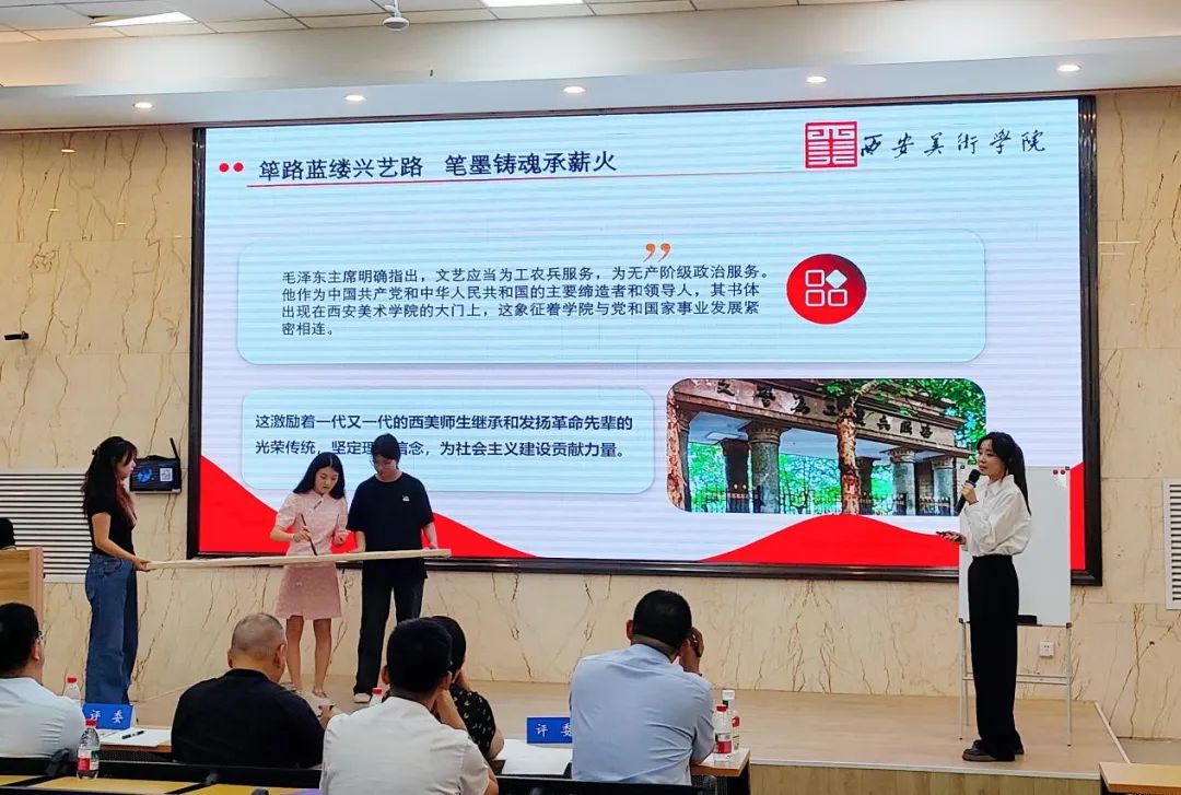 本次“大学生讲思政课”比赛自4月份启动报名以来,经过院系初赛推荐、专家初审与复赛选拔,共有16组优秀团队晋级决赛。决赛选手紧扣西美校史、延安精神、文化自信、乡村振兴等主题,结合专业特色,将艺术创作与思政教育深度融合,通过案例分析、影像展示、现场绘画演示等形式,生动诠释了思政课的理论内涵,充分展现了西美学子的理论素养与精神风貌。