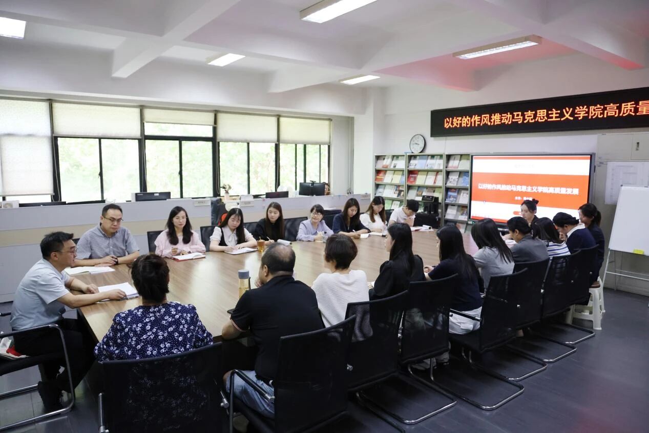 邱必震首先与大家一同学习领会习近平总书记关于加强党的作风建设的重要论述,重温习近平总书记在全国学校思想政治理论课教师座谈会上的讲话精神。结合工作实际,围绕作风建设这一核心命题,从三个维度深入展开阐释。一是铸魂固本,坚守方向,弘扬好的学风。强调思政课教师加强理论学习的重要性,指出理论只有彻底才能真正说服人。思政课教师不能仅满足于课程教学内容,还需将学习延伸至课堂之外的广阔领域,全方位提升理论素养。二是立足艺脉,彰显价值,树立好的师德教风。思政课教师作为学生成长道路上的引路人,需要有独特的人格魅力,把“六要”作为基本素养要求,始终做到为人师表、行为示范,将“立身、立言、立德”贯穿于教育教学全过程,自觉弘扬教育家精神,树立良好的教风师德,持续提升业务能力,为学生作好示范树立榜样。三是党建赋能,融合创新,建设好的院风。理想信念是凝聚团队力量的核心纽带,全体教师要坚定目标,凝聚共识,合力推动马克思主义学院建设发展。要加强班子和教师队伍建设,主动倾听教师心声,切实解决教师关切的实际问题,将教师的“心上事”转化为干部的“上心事”,以高质量党建引领促进学院各项工作创新发展。他强调,要深入学习贯彻习近平总书记关于加强党的作风建设的重要论述,不断强化“在马言马、马院信马”的意识和标准,进一步提高上好思政课、办好马克思主义学院的责任感使命感紧迫感。要持续一体推进学查改,推动学习教育不断走向深入,以作风建设新成效开创马克思主义学院高质量发展新局面。