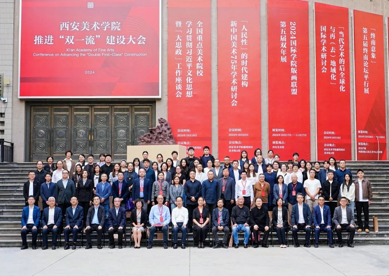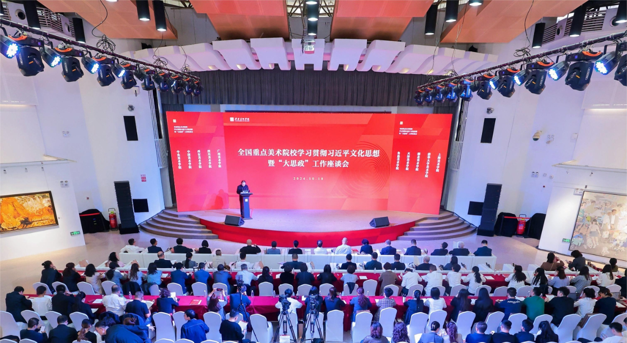 值习近平总书记主持召开文艺工作座谈会并发表重要讲话十周年之际,为深入学习贯彻习近平文化思想和党的二十届三中全会精神,充分发挥艺术资源在“大思政课”建设中的独特作用,探索艺术院校“大思政课”建设的有效路径。2024年10月18日下午,由全国重点美术院校共同主办,西安美术学院承办的学习贯彻习近平文化思想暨“大思政”工作座谈会在西安美术学院美术馆A馆召开。中国美术学院党委书记金一斌,广州美术学院党委书记林蓝,西安美术学院党委书记丁巨涛,天津美术学院党委副书记、院长邱志杰,湖北美术学院副院长张炼,四川美术学院党委常委、宣传部部长贾安东,上海美术学院党委书记陈静,清华大学美术学院副院长董书兵分别代表各自学院作主旨发言。党委副书记任晓峰,党委副书记、纪委书记、监察专员李翔宇,党委副书记李四军、邱必震,党委委员、副院长屈健,副院长武小川,中共陕西省委宣传部理论处副处长罗军、中共陕西省委教育工委宣传部副部长王世娟等出席座谈会。座谈会由党委副书记、院长朱尽晖主持。