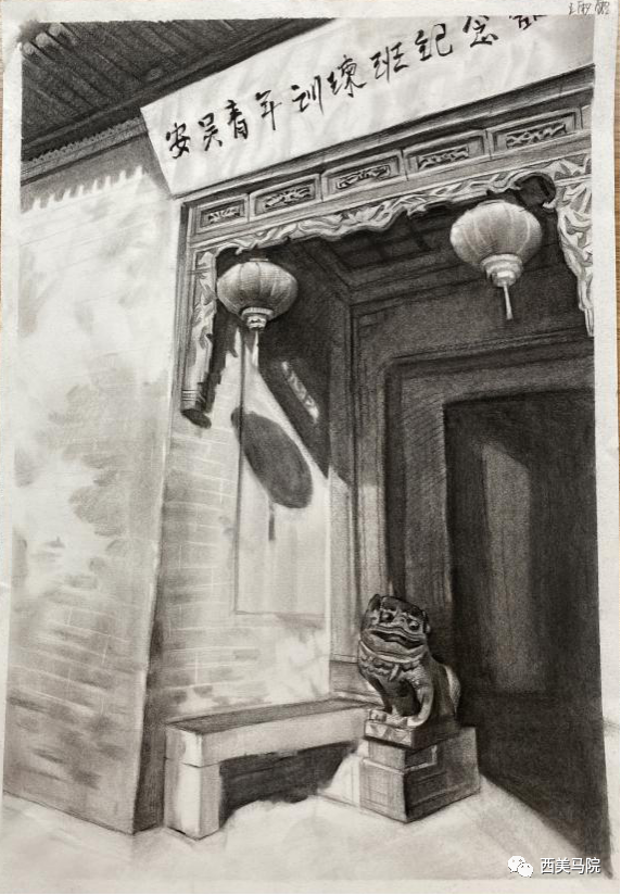 在去往安吴青训班的路上,就已经被静谧的环境深深吸引。正午的阳光伴着斑驳的树影落在刚劲有力的“安吴青训”的牌匾上,熠熠生辉。老树苍劲挺拔,楼阁屋檐精致无比,我试着放大照片捕捉浮雕的走向,很难想象前人精湛的工艺,连连叫绝。在青训班的路上慢慢走着,眼前仿佛有画面一帧帧地略过,穿着朴素衣服的革命青年跨过木门槛,朝气蓬勃,意气风发,眼里溢满对国之爱。他们在这里学习、沉淀,为国效力。参观安吴青训班,不仅仅是在敬畏过去,更是在激励我们当代青年,尤其是对美院学生的创作方向给予引导,更好地为时代挥洒笔墨,服务人民群众。