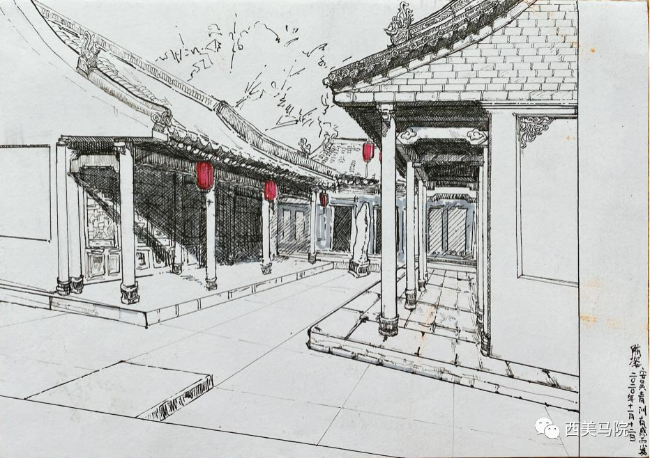 画面呈现的是经过汹涌历史长河冲刷,沉淀下来的安吴青训班大宅。使用的手法只是简单的黑笔风景速写,表达的却是一段不可被遗忘的故事。在老师们的带领下,我们参观了安吴青年训班纪念馆。走在路上,听着老师详细的介绍青训班的历史,感受抗战时期觉醒青年们的一腔热血,还有周莹的传奇一生。这里曾经是安吴寡妇周氏的正院,也是爱国青年集中学习训练的基地,那股红色安安稳稳的藏在大院里,等着人们将她传承。于是我用我的画笔细细描摹着那个年代流传下的痕迹,用抽象的线条代替一切言语,馆内的每一处物件都在诉说着那段艰苦卓绝的历史。